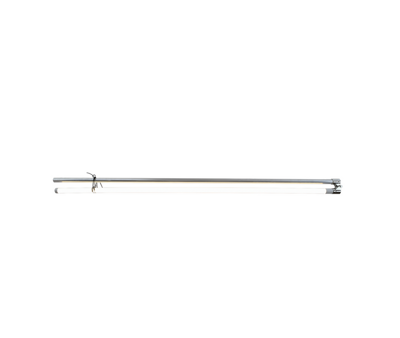 ロングランプは小さなランプとデザインを統一し、ベルリンの同じフラット向けに設計されています。もう一方のランプがコーヒーテーブル用として設計されたのに対し、こちらは縦横比約3:1の長方形のダイニングテーブルを照らす必要があります。この要件を満たすため、ネオン管の使用を検討していましたが、調査中に内部にLEDストリップを内蔵したプラスチック製ライトチューブを発見しました。調光可能で破損しにくい特性は、私の構想に最適な解決策でした。光源を選定後、この標準的な照明チューブをいかにしてミニマルかつエレガントなダイニングテーブルランプに仕上げるかが課題となりました。当時、工作機械の利用が制限されていたため、ランプの正確な長さに合わせたアルミパイプ、ヨット用スチールパイプコネクター、スチールケーブル取り付けキット(球状ケーブルストッパー付き)を注文しました。パイプコネクターの内側とアルミパイプにそれぞれ穴を開け、一方の側で照明シリンダーをアルミパイプに取り付けました。反対側には異なる素材を使用し、中国式幸運結びの革紐で平行に保持する構造としました。残る作業は、天井への取り付け用穴をアルミパイプに数箇所開け、電源までケーブルを引き込むことだけでした。